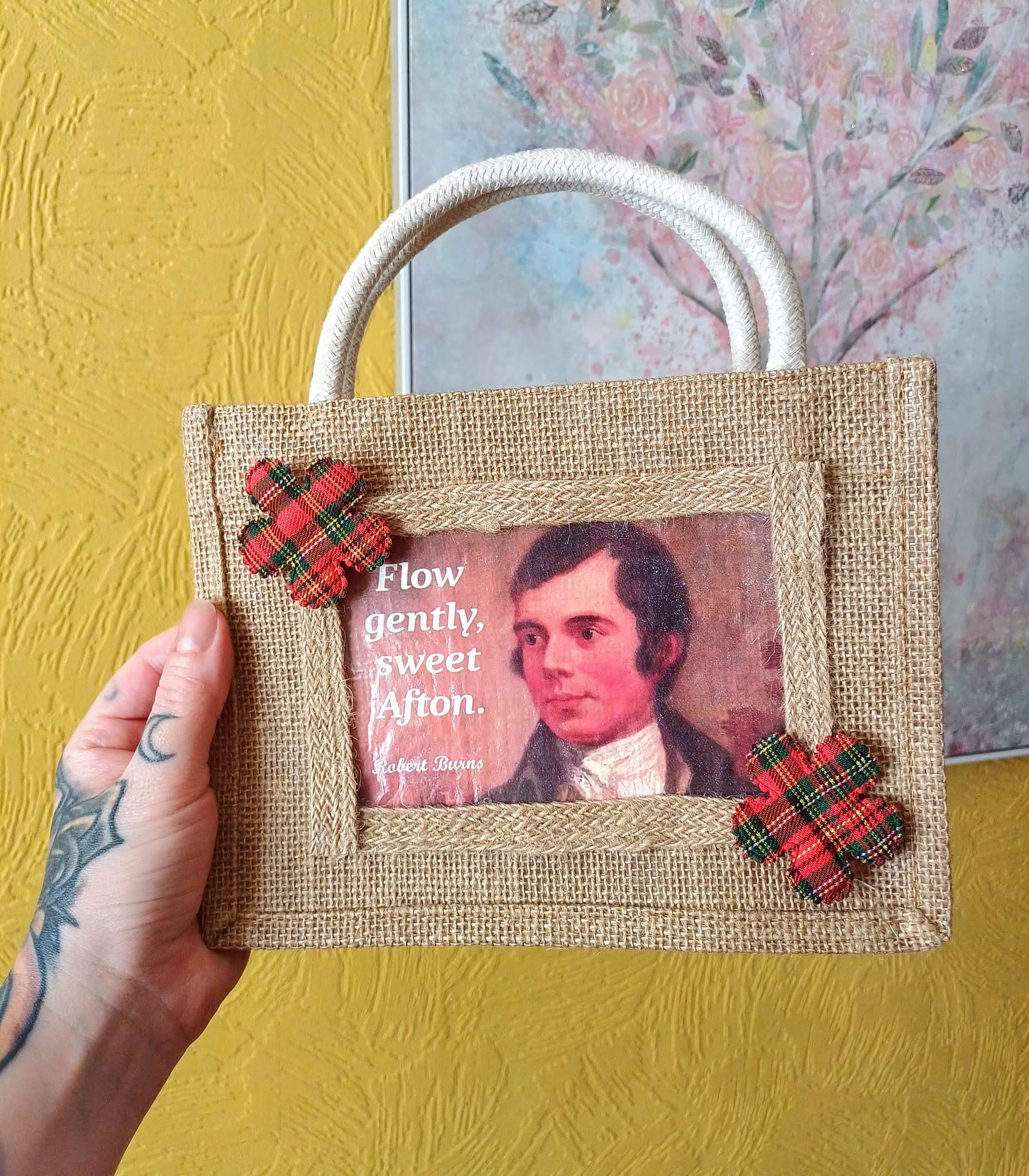 Beautifully decorated jute shopping bag! Four eye catching designs available with added ribbon embelishments. Cute badger or parrot, both would make a lovely gift. Rabbie Burns and sheep available too.